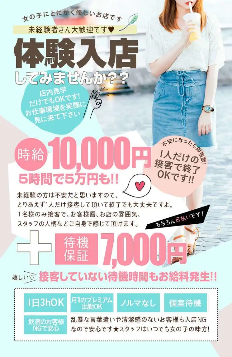 まずはお試し体験からスタート!1時間のみ・1名接客のみとご希望の体験をして頂けます。もちろん体験時の保証もしっかりとさせて頂きます。1時間1万円・2時間2万円と体験時間ごとに体験保証額を完全保証致します。まずは一度1日体験から始めてみましょう♪